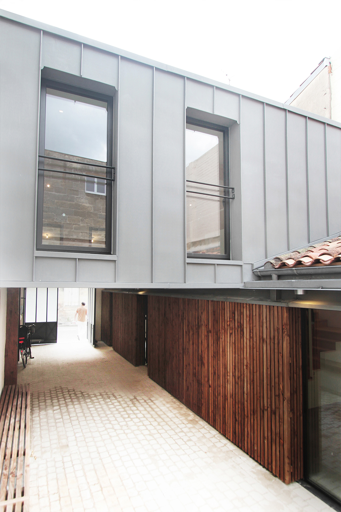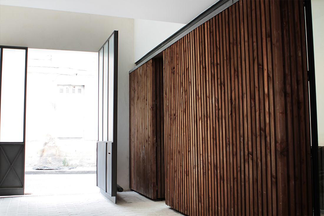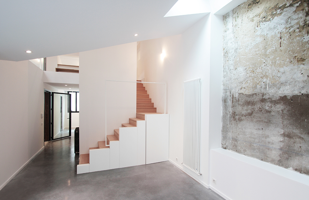 Ancienne Echoppe dans une parcelle enclavée, le nouveau bâtiment s’installe derrière la façade existante conservée. Construite à la demande de la nouvelle propriétaire, l’ensemble de la maison a été conçue pour répondre aux contraintes d’accessibilité PMR. L’ensemble des espaces sont décloisonnés, un élévateur permet l’accès au niveau supérieur et l’ensemble des espaces de vie s’ouvre sur la cour pavée de la maison.